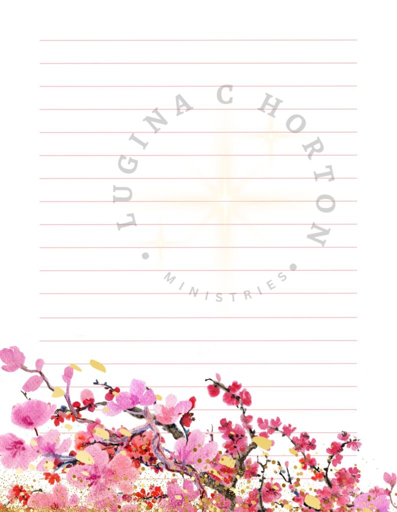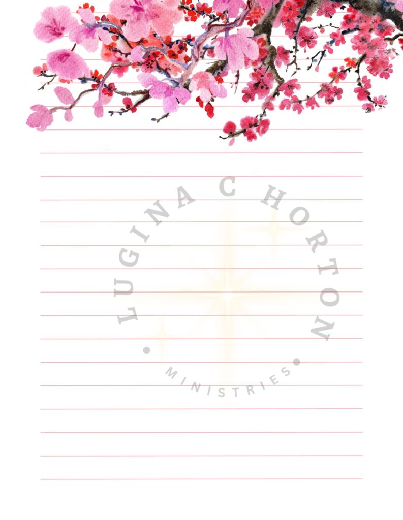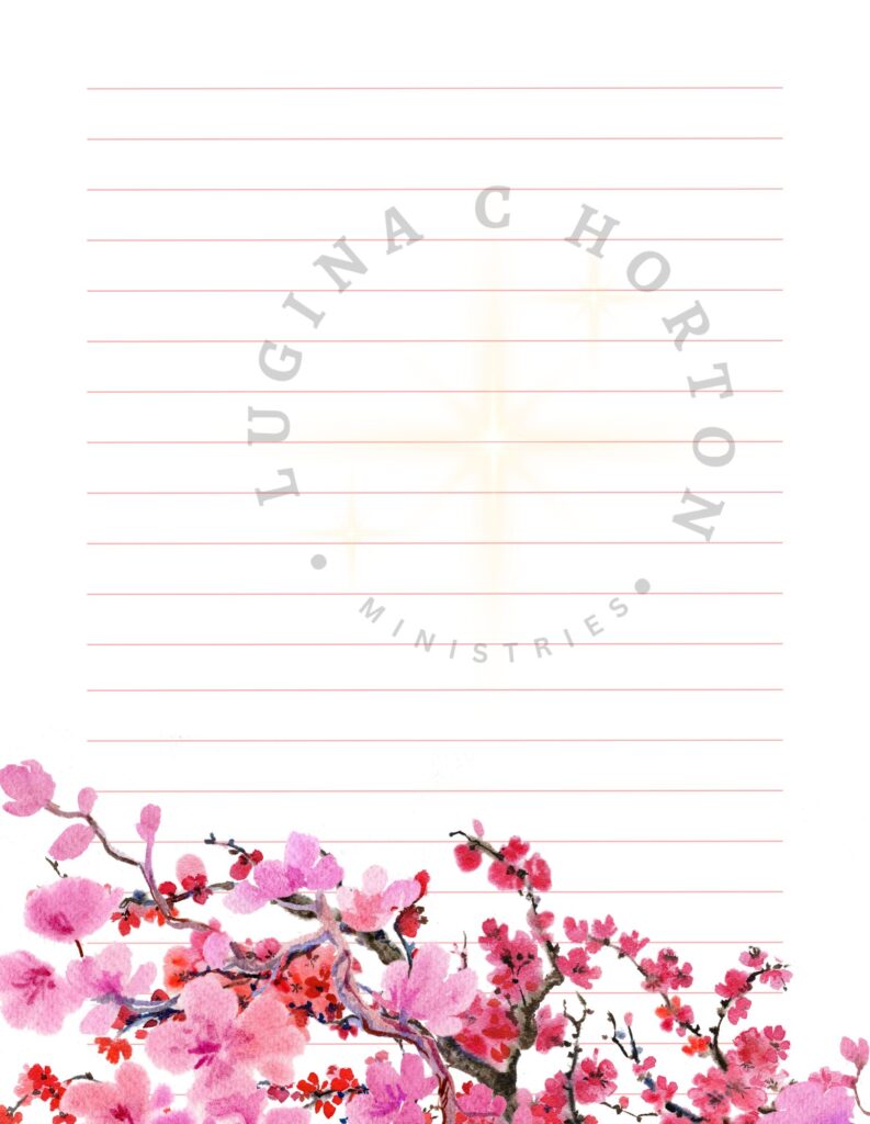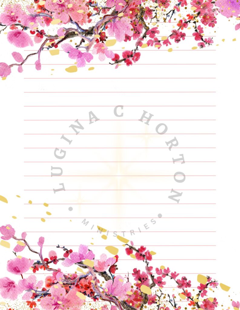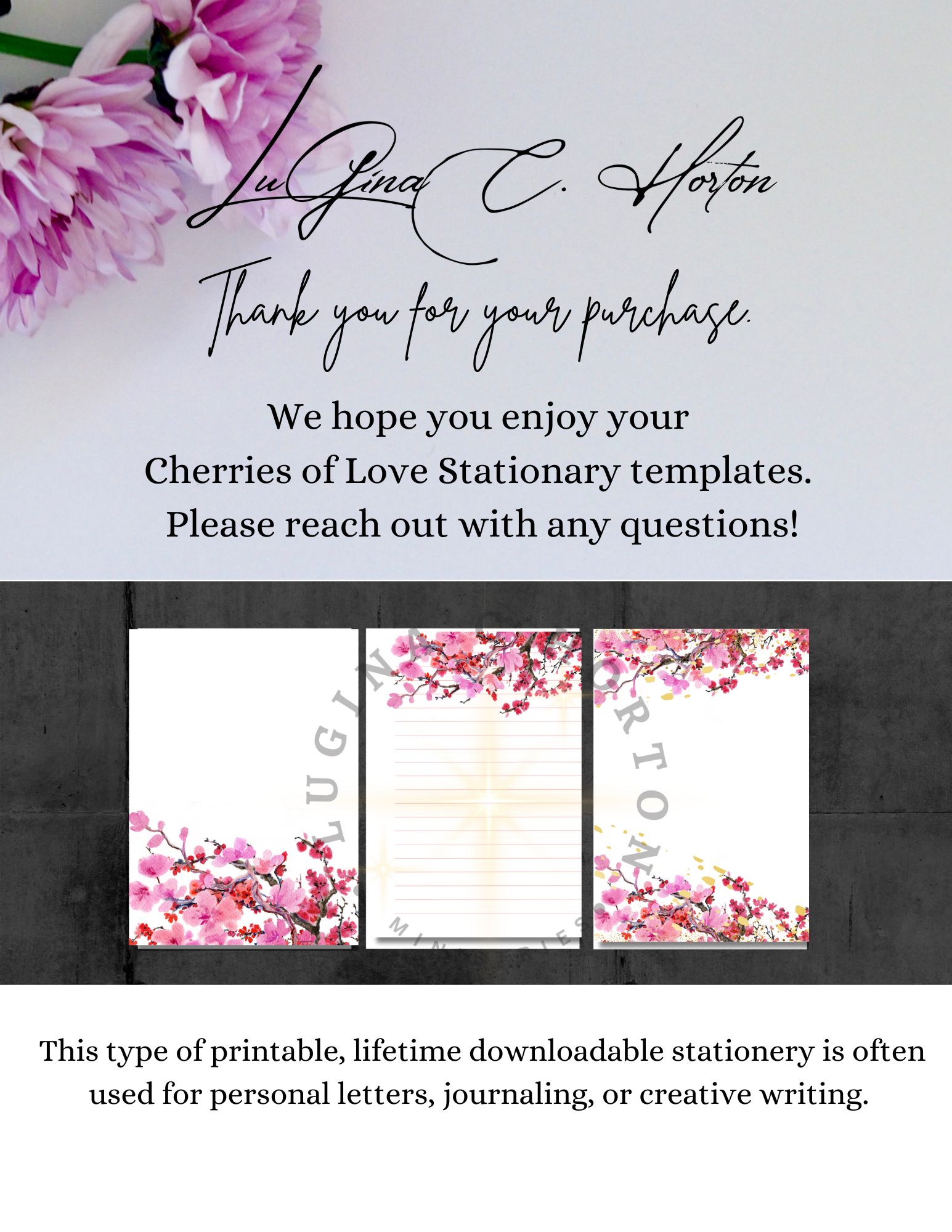 This Cherries of Love image is a piece of printable, downloadable decorative lined stationery with an artistic design featuring cherry blossoms.